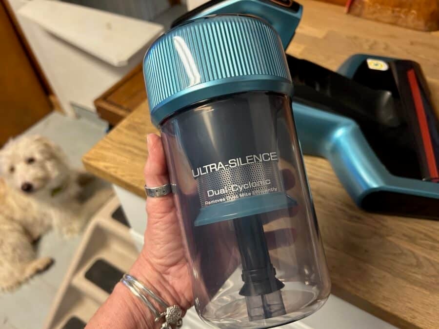 Was the dustbin able to hold a large capacity? Yes! The cup can hold half a liter of dust. It’s clear so it’s easy to see when it’s time to empty. The dustbin is washable. I was shocked by the fine, fine dust the dustbin contained when I emptied it! I had already vacuumed the dog bed for the day–so this was EXTRA dust and mites that my regular vacuum had not picked up.