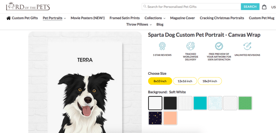 I chose the “Sparta Dog Custom Portrait” which is an artistic rendering of your photo and which comes with a variety of background options: