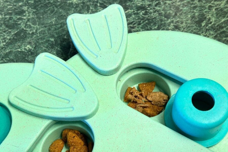 This toy sits in the beginner-to-intermediate level of difficulty — perfect for pups who are new to puzzles or seasoned learners who need a fun challenge. I used this toy with Isla when she was just a few months old and she loved it; our cat Lucky also really enjoys this toy.